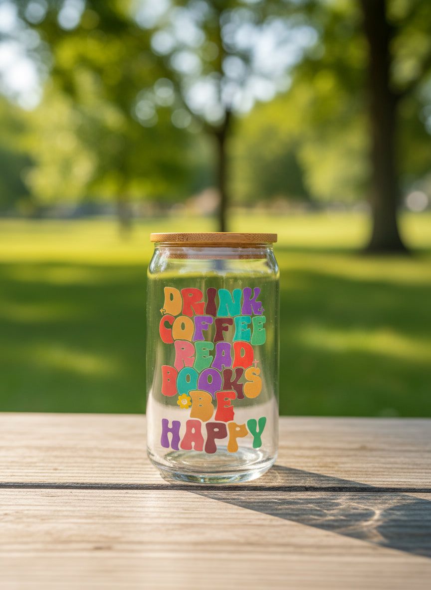 Enjoy your hot or cold beverage in this playful glass jar, proudly displaying Boho Rainbows UVDTF design. It includes a bamboo lid and a glass straw for an eco-conscious touch. Just a heads up—this jar loves a gentle hand wash!